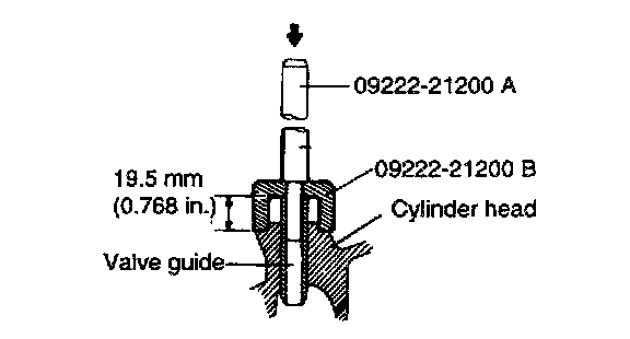 3. Using the special tool (09222-21200 A, B), press-fit the valve guide. The valve guide must be press fitted from the upper side of the cylinder head. Keep in mind that the intake and exhaust valve guides are different in length.