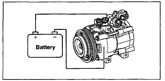 Connect the compressor terminal to battery(+) and the battery(-) terminal to the compressor body. Verify magnetic clutch operation by a clicking noise.