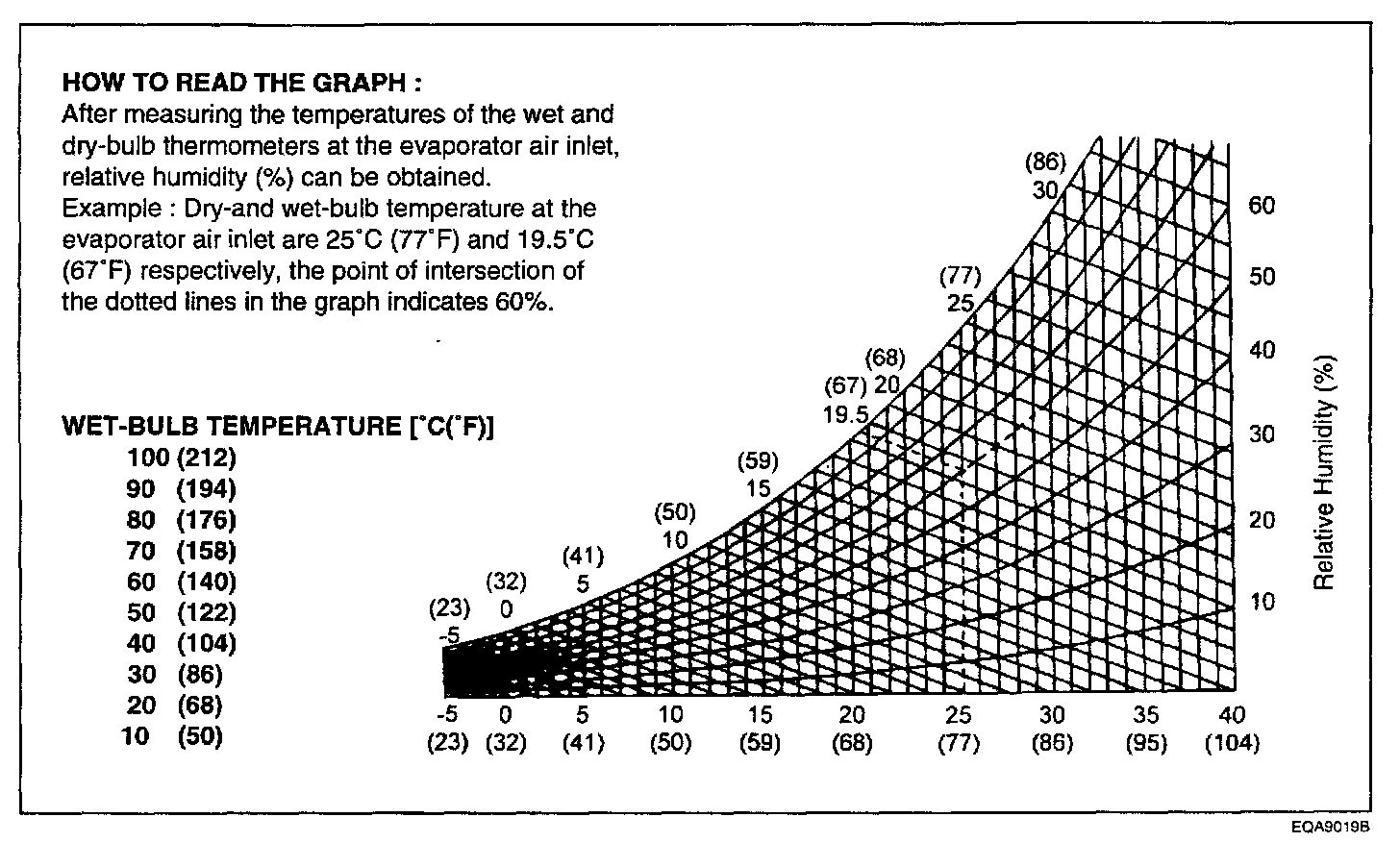 10. Check that the intersection of the relative humidity and temperature difference falls within the block. If the intersection is within the block, cooling performance is satisfactory.