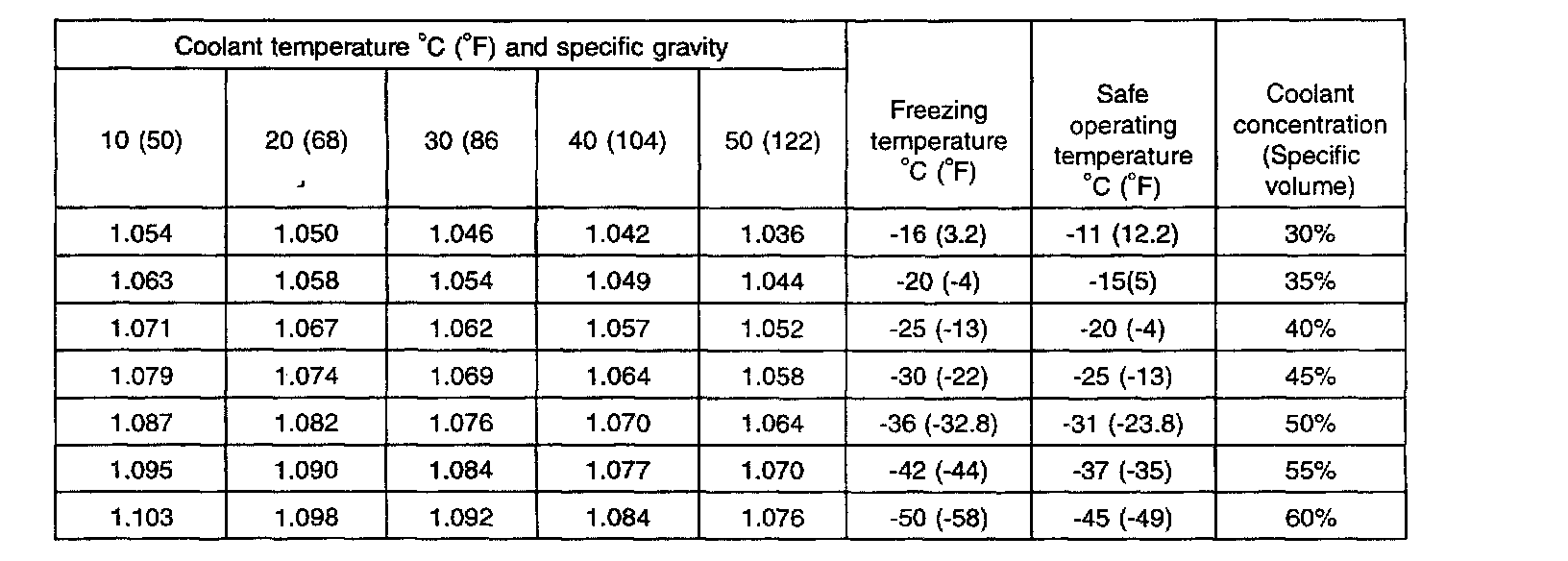 RELATION BETWEEN COOLANT CONCENTRATION AND SPECIFIC GRAVITY