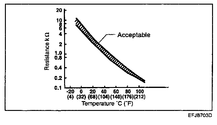 The engine coolant temperature sensor installed in the engine coolant passage of the cylinder head detects the engine coolant temperature and emits signals to the PCM. This part employs a thermistor which is sensitive to changes in temperature. The electric resistance of the thermistor decreases in response to a temperature rise (NTC). The PCM determines engine coolant temperature by the sensor output voltage and provides optimum fuel enrichment when the engine is cold.