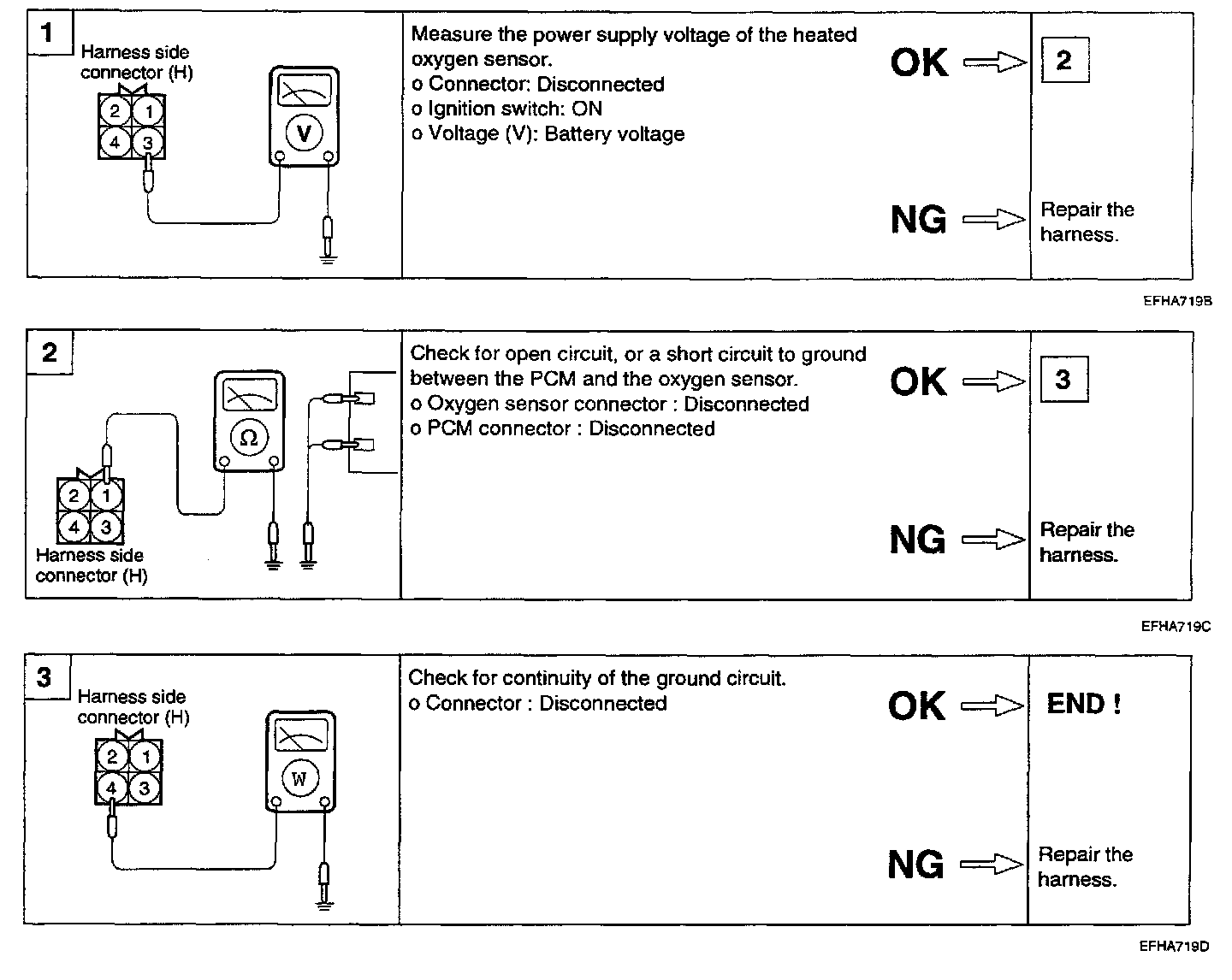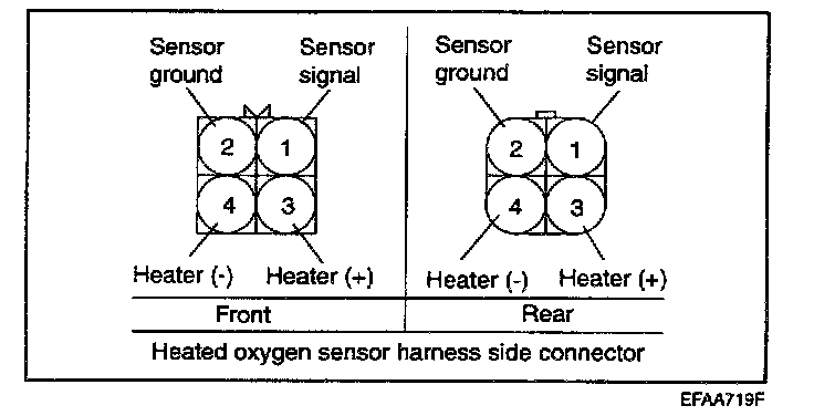 1. Disconnect the oxygen sensor connector, and measure the resistance between terminal 3 and terminal 4.