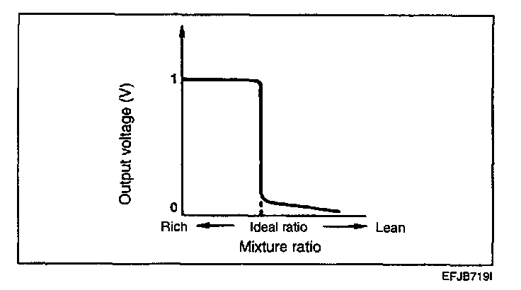 HEATED OXYGEN SENSOR (HO(2)S)The heated oxygen sensor senses the oxygen concentration in exhaust gas and converts it into a voltage which is sent to the PCM. For Zirconium type sensors, (L4) the oxygen sensor outputs about 1 V when the air fuel ratio is richer than the theoretical ratio, and outputs about 0 V when the ratio is leaner (higher oxygen concentration in exhaust gas.). The PCM controls the fuel injection ratio based on this signal so that the air fuel ratio is maintained at the stoichiometric ratio. The oxygen sensor has a heating element which ensures sensor performance during all driving conditions.