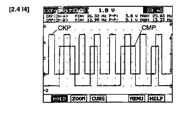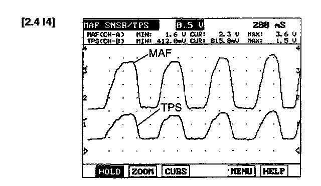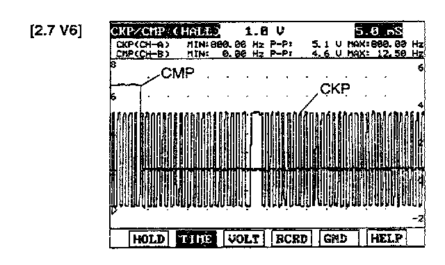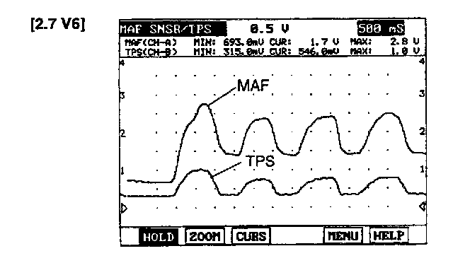 MAJOR SENSOR REFERENCE WAVE-FORMSThe followings are the major sensor reference wave-forms. Below is the data for CMP, Mass Air Flow Sensor, Throttle Position Sensor, Rear O(2) Sensor, Front O(2) Sensor and Injection Pulse when revving quickly up to 4800 rpm under no load after warming up engine sufficiently. Each value is for reference, the exact values may vary.