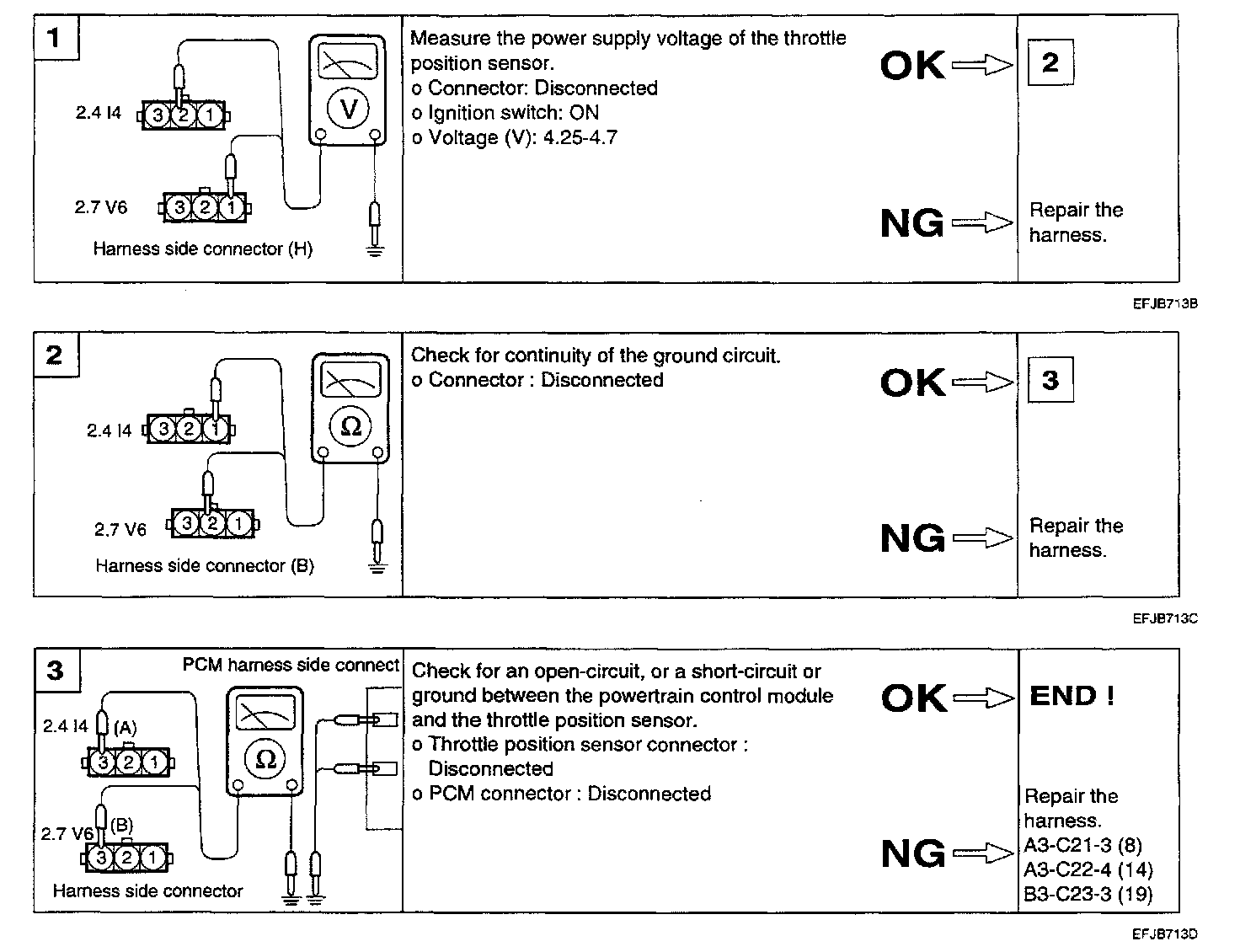 2. For 2.4 L4 measure the resistance between terminal 1 (sensor ground) and terminal 2 (sensor power), for 2.7 V6 between terminal 2 (sensor ground) and terminal 1 (sensor power).