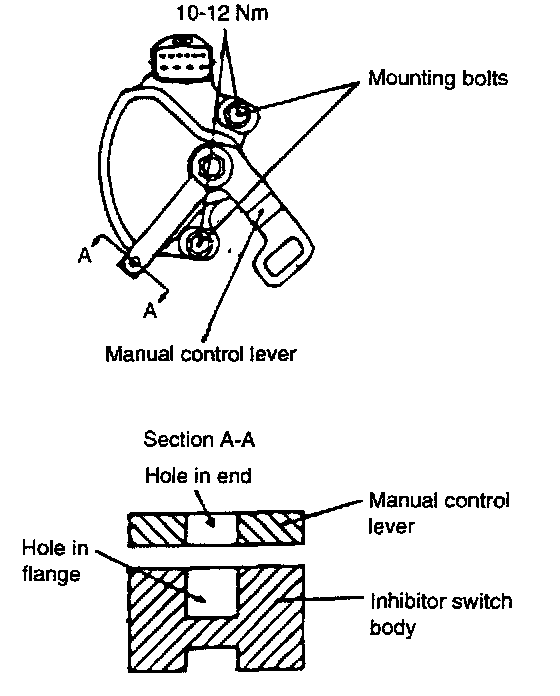4. Loosen the transaxle range switch mounting bolts and then turn the transaxle range switch body so the hole in the end of the manual control lever and the hole (cross section A-A in the figure) in the flange of the transaxle range switch body are aligned.