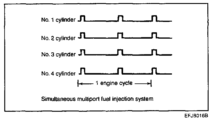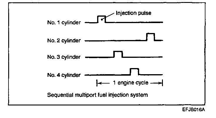 The injector drive times and injector timing are controlled so that the optimum air/fuel mixture is supplied to the engine to correspond to the continually-changing engine operation conditions. A single injector is mounted at the intake port of each cylinder. Fuel is sent under pressure from the fuel tank by the fuel pump, with the pressure being regulated by the fuel pressure regulator. The fuel thus regulated is distributed to each of the injectors. Fuel injection is normally carried out once for each cylinder for every two rotations of the crankshaft. The firing order is 1-3-4-2.This is called multiport. The ECM provides a richer air/fuel mixture by carrying out "open-loop" control when the engine is cold or operating under high load conditions in order to maintain engine performance. In addition, when the engine is warm or operating under normal conditions, the ECM controls the air/fuel mixture by using the heated oxygen sensor signal to carry out "closed-loop" control in order to obtain the theoretical air/fuel mixture ratio that provides the maximum cleaning performance from the three way catalyst.