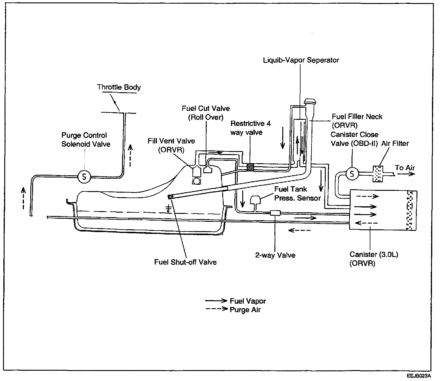 While refueling, the flow and column of the refueling draws the ambient air into the filler pipe so as not to emit fuel vapor in the air. The fuel vapor in the tank is then forced to flow into the canister via the fill vent valve and the fuel liquid/vapor separator which isolates liquid fuel ingredient and transfers the pure vapor to the carbon canister.