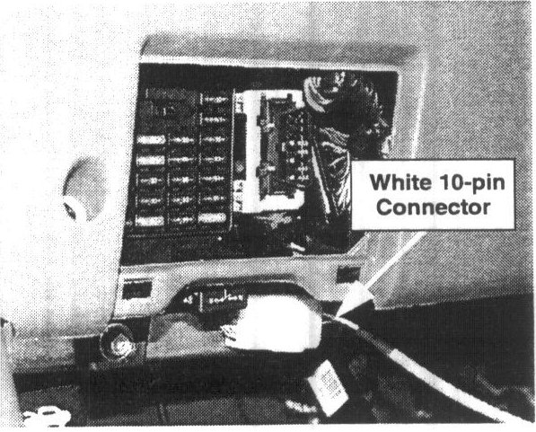 26. Connect the WHITE 10-pin connector to the Hi-Scan Reprogramming Adapter and then into the white connector near the Data Link Connector (DLC).