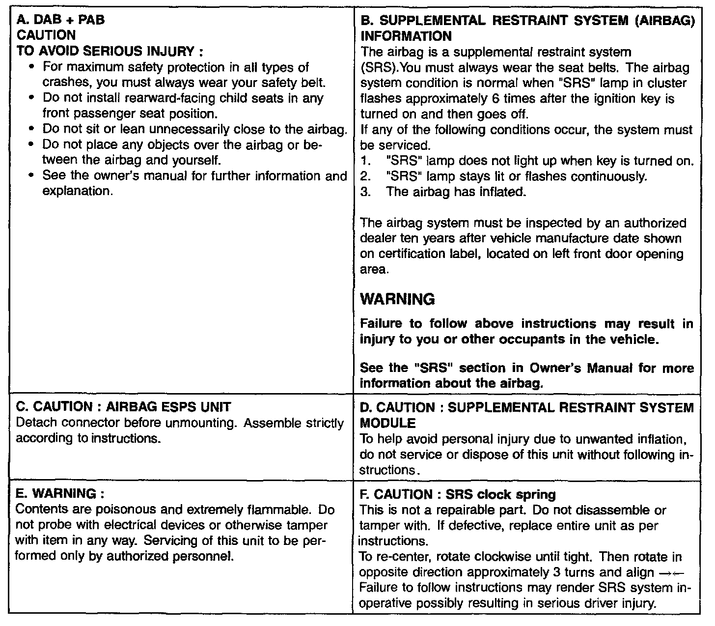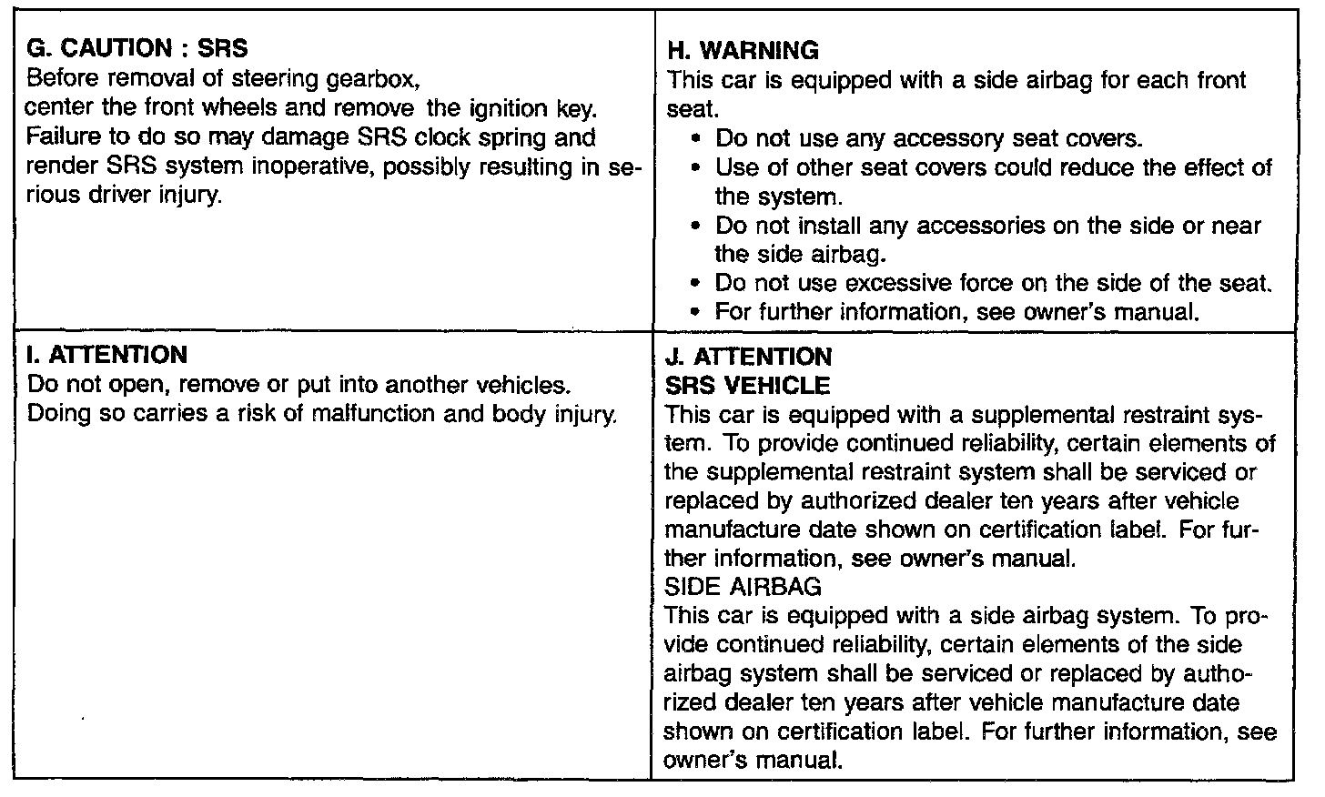 A number of caution labels relating to the SRS are found in the vehicle, as shown in the illustration. Follow the label instructions when servicing the SRS.