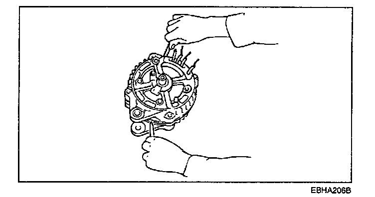 Before the rotor is attached to the rear bracket, insert a wire through the small hole in the rear bracket to hold the brush. After the rotor has been installed, the wire can be removed.