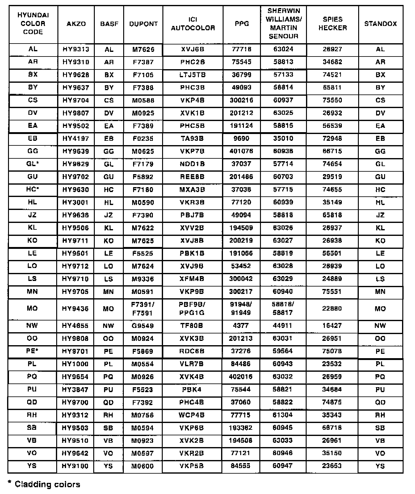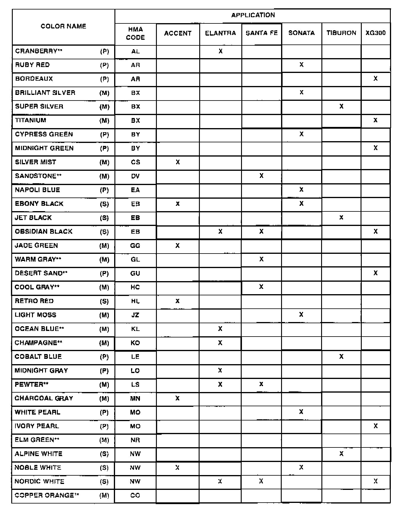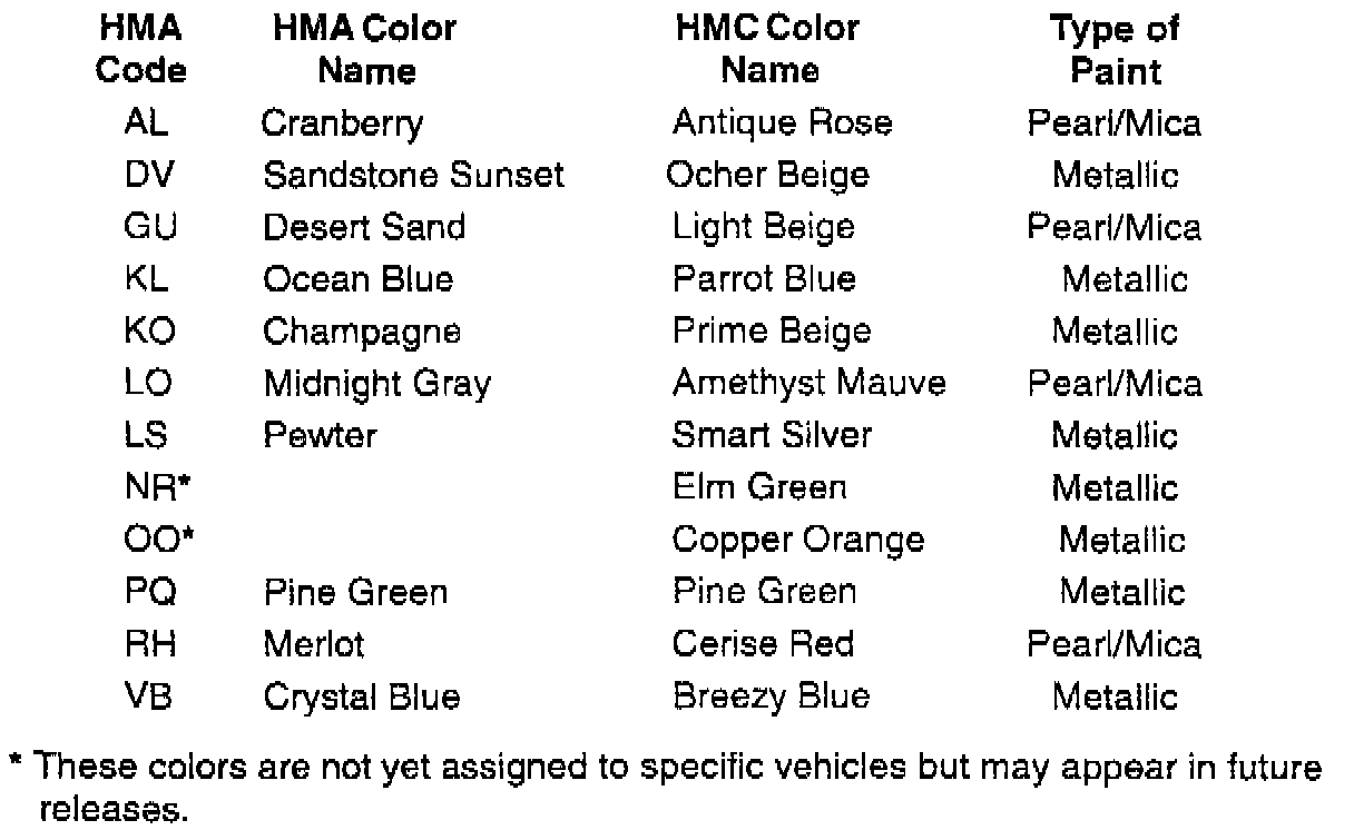 TABLE I: 2001 HYUNDAI EXTERIOR COLOR CODES AND APPLICATIONS
