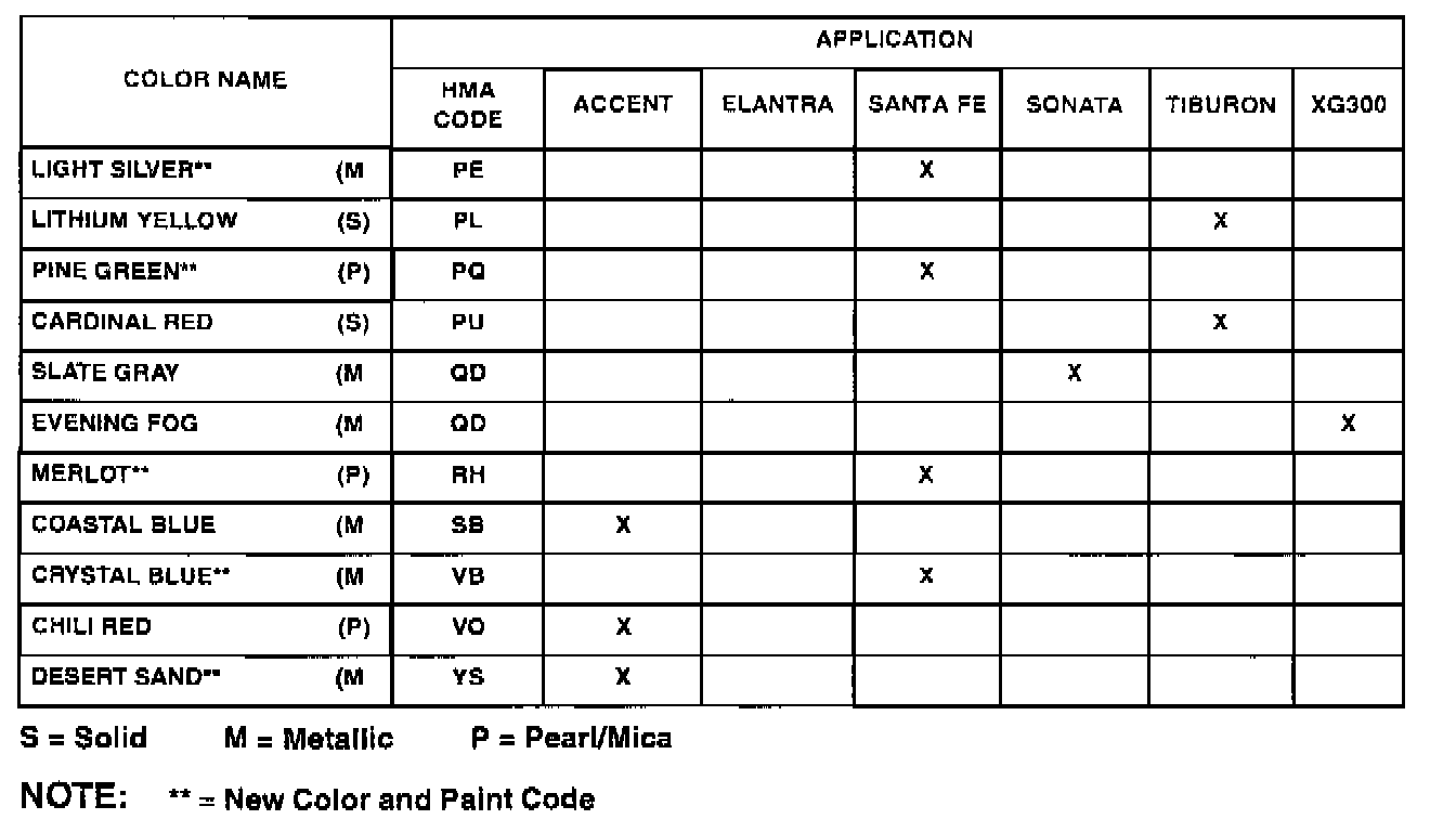 This TSB provides information on both new and carry over 2001 model year exterior colors. It includes paint codes, vehicle applications and paint manufacturers' stock numbers for the Accent, Elantra, Santa Fe, Sonata, Tiburon and XG300.