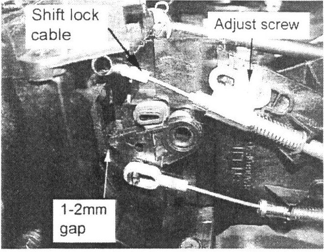 9. Move the shift lock adjustment cable until the gap shown in the illustration is 1-2 mm (0.04-0.08").