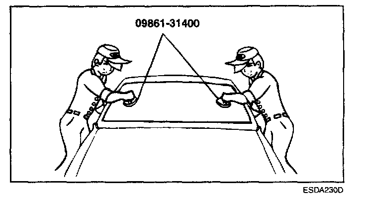 10. Using suction cups or the special tool (09861 - 31400), lower the glass over the opening, align it with the marks made in step 3 and set it down on the sealant.
