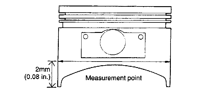 6. To rebore the cylinder bore to the oversize, maintain the specified clearance between the oversize piston and the bore and make sure that all used pistons are the same oversize. The standard measurement of the piston outside diameter is taken at a level of 12 mm (0.47 inch) above the bottom of the piston skirt and across the thrust faces.