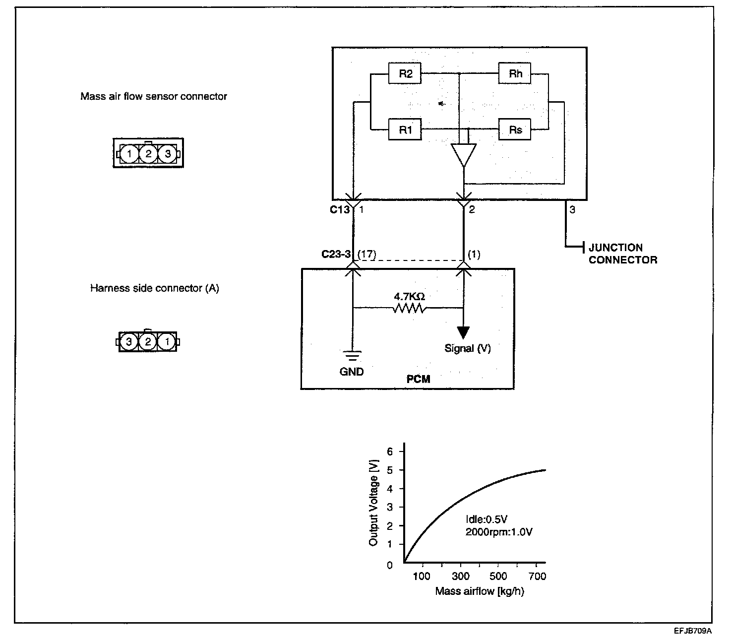 This hot film type air flow sensor is composed of a hot film sensor, housing and metering duct (hybrid, sensor element). Mass air flow rate is measured because the change of the mass air flow rate causes of heat being transferred from the hot film probe surface to the air flow. The air flow sensor generates a pulse so it repeatedly opens and closes between the 5 V voltage supplied from the powertrain control module.