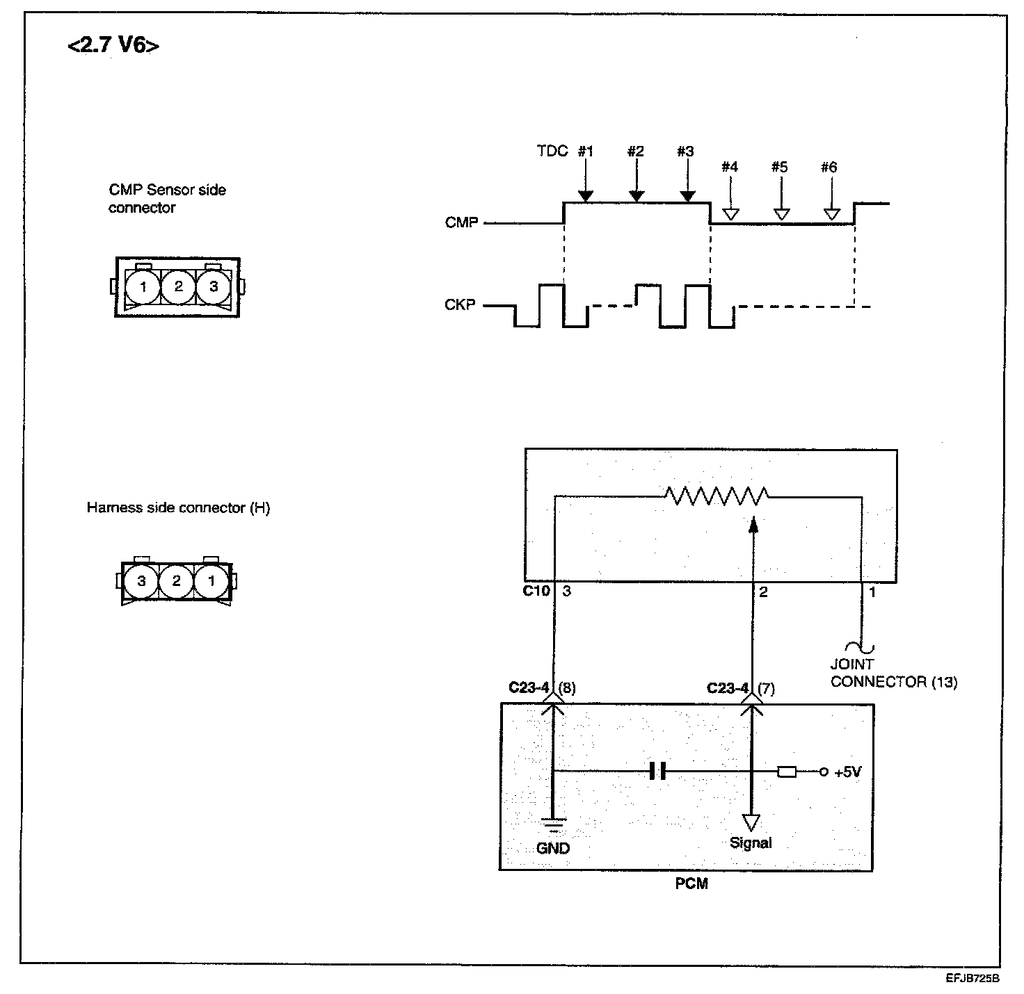CRANKSHAFT POSITION SENSORThe crankshaft position sensor is a Hall-effect sensor that senses the crank angle (piston position) of each cylinder and converts it into a pulse signal. Based on the input signal, the PCM computes the engine speed and controls the fuel injection timing and ignition timing.