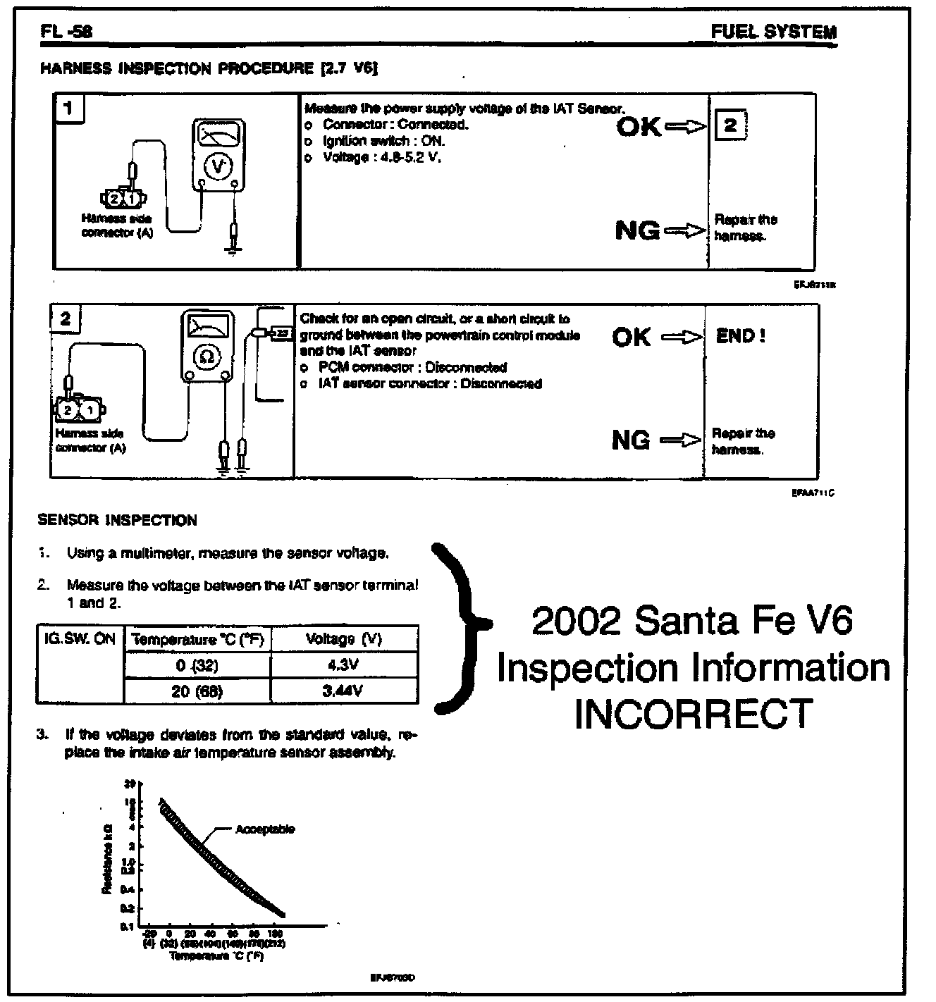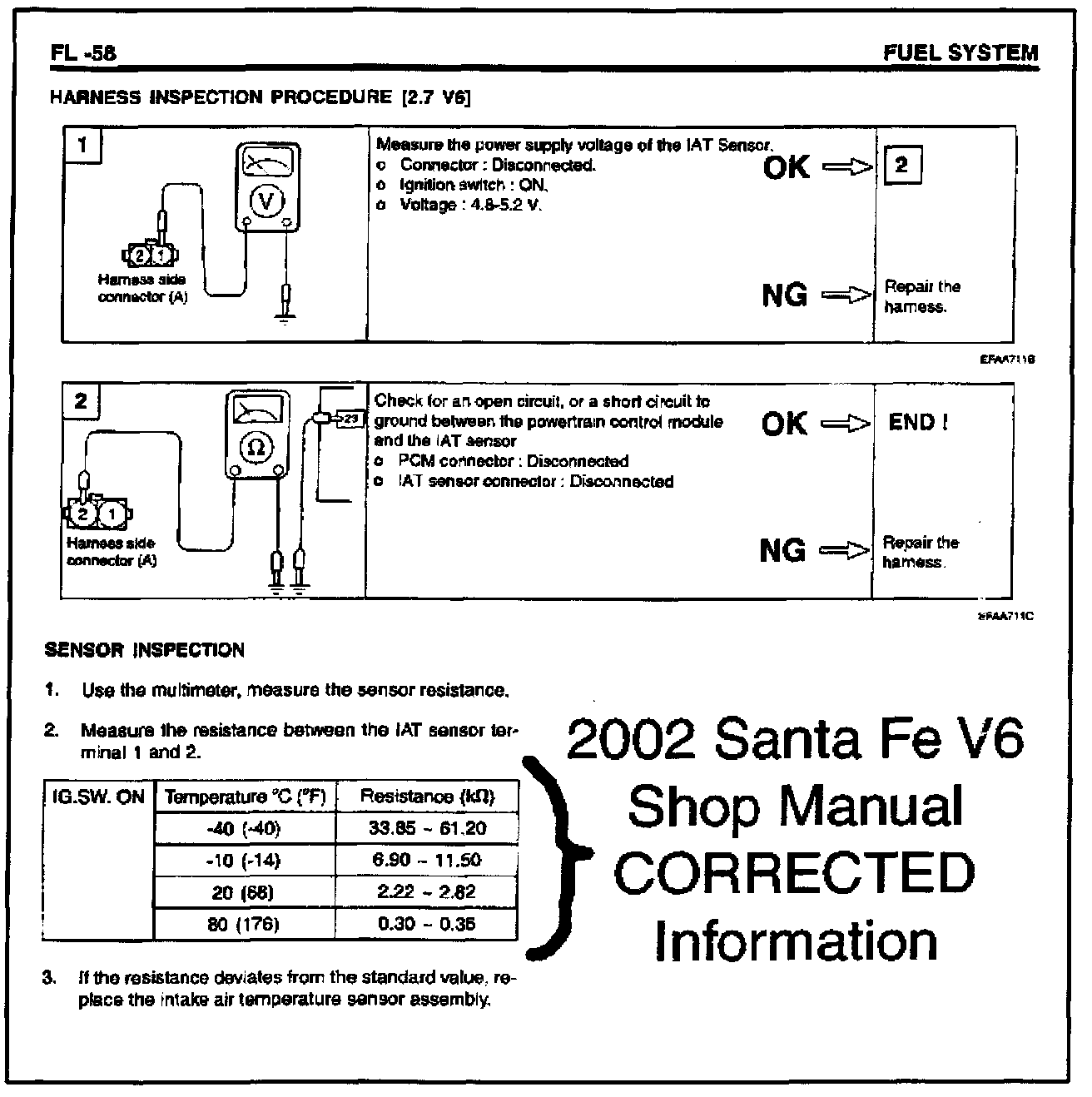 2001-02 SANTA FE V6 INTAKE AIR TEMPERATURE (IAT) SENSOR RESISTANCE SHOP MANUAL CORRECTION