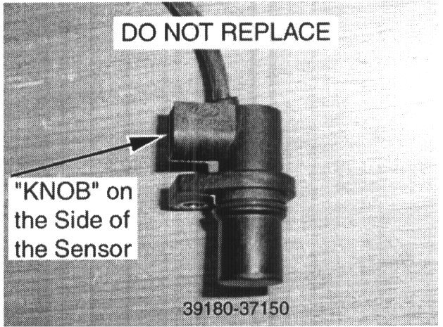 IF: The wiring of the CKP sensor comes out straight from the top of the sensor (as shown in the picture) AND DOES NOT have a 90 degree plastic "knob" at the top of the sensor, then REPLACE the sensor, following the instructions below.