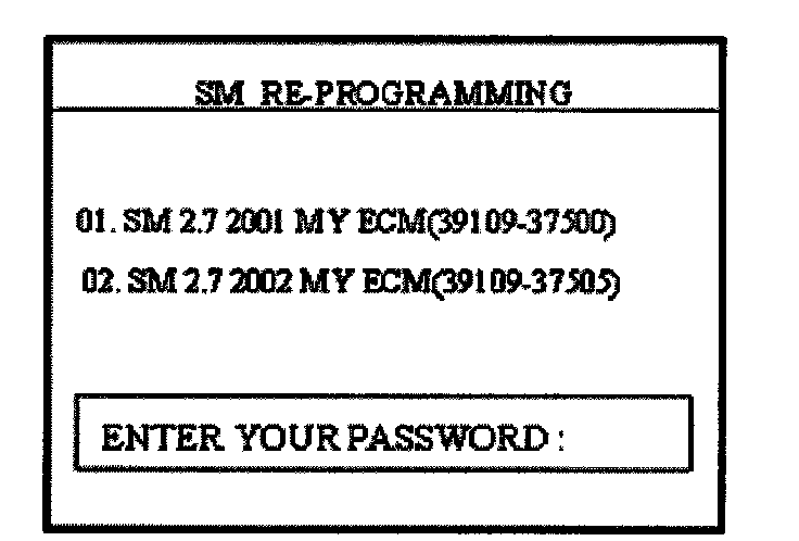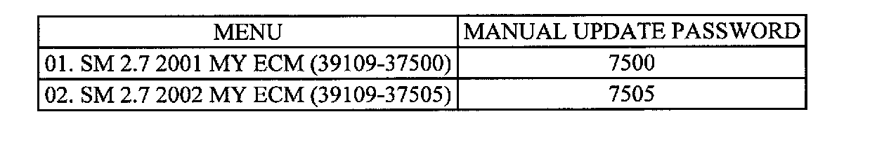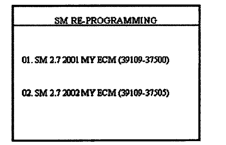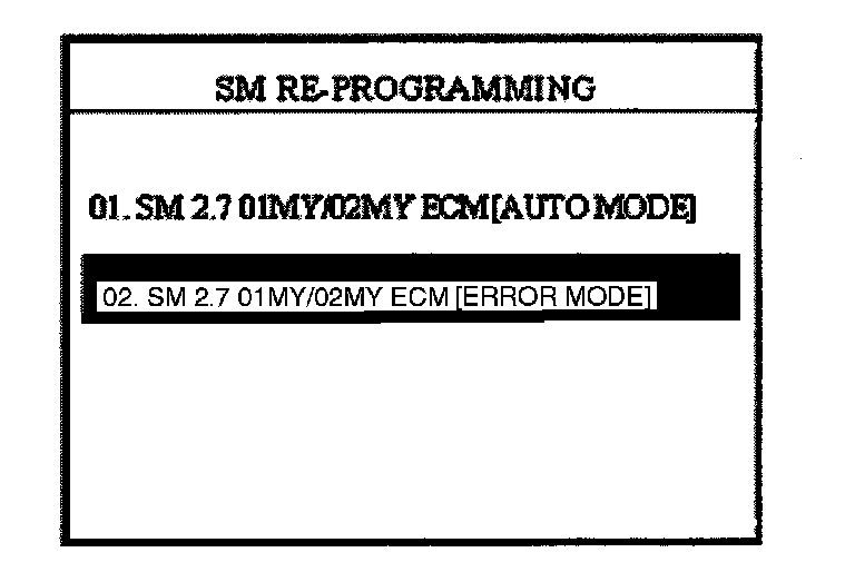 NOTEIn the event that menu option "01. SM 2.7 01MY/02MY ECM/AUTO MODE]" does not download the new program, option "02. SM 2.7 01MY/02MY ECM [ERROR MODE]" must be used.