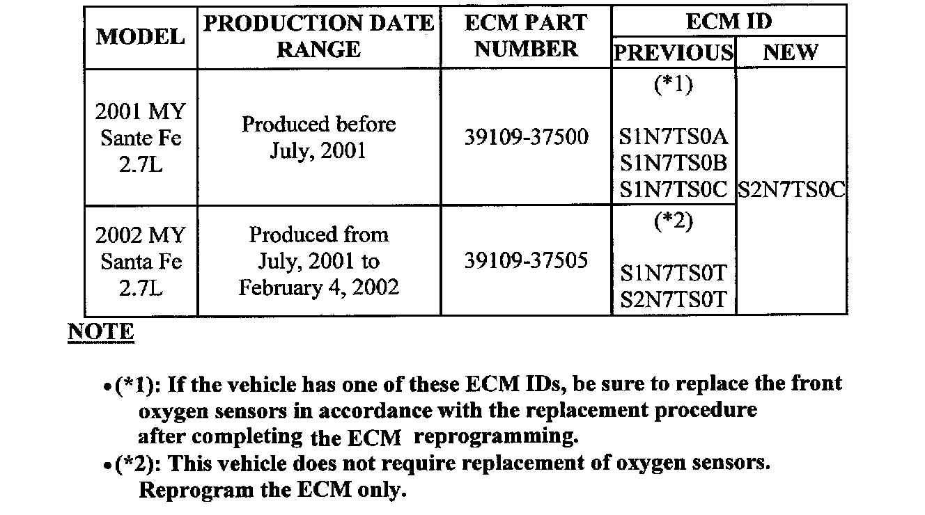^ Be sure to check and record the current (old) ECM ID to determine if both front oxygen sensors need to be replaced. If the current ECM ID is one of those listed below, be sure to replace the front oxygen sensors after reprogramming.