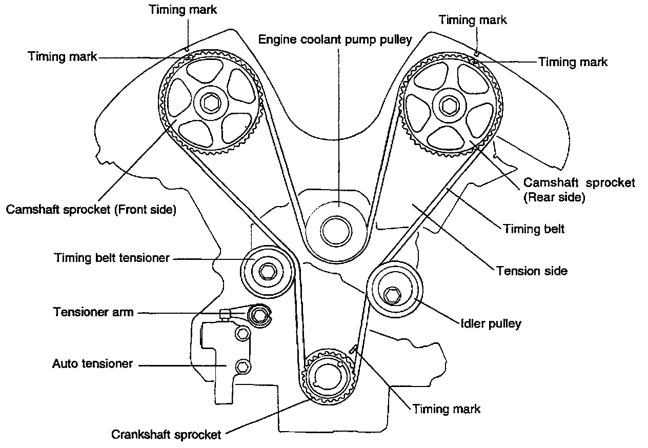 Crankshaft sprocket -> Idler pulley -> Intake cam sprocket (LH side) -> Power steering pump pulley -> Intake cam sprocket (RH side) -> Tensioner pulley.