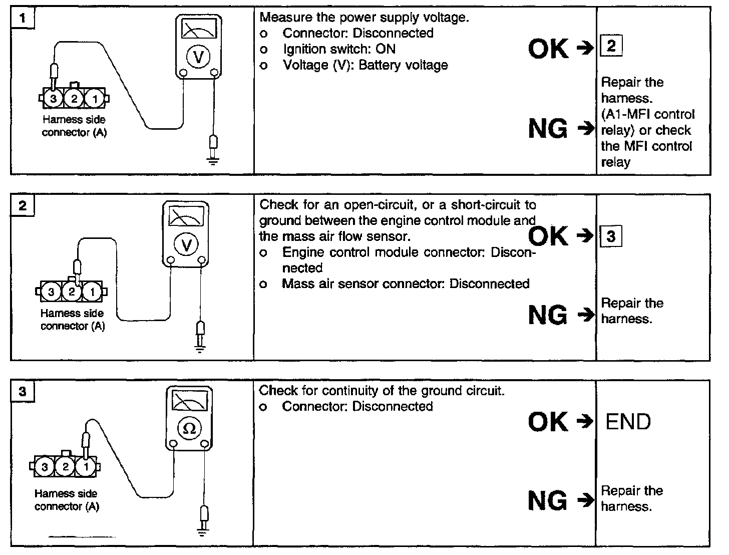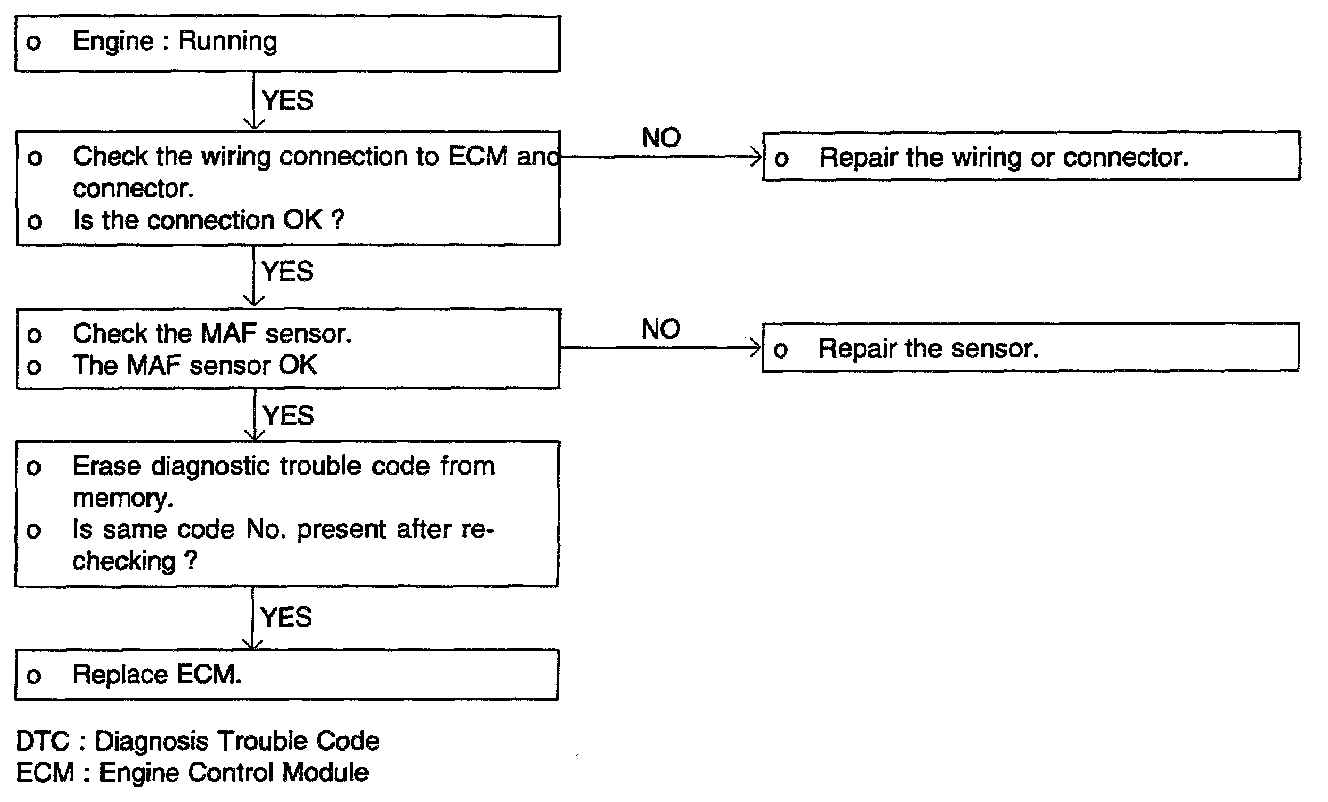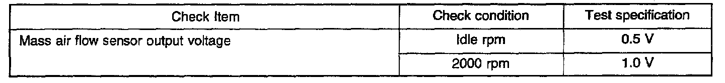 2. If the MAF sensor output voltage is other than 0 when the ignition switch is turned on (do not start the engine). Check for the faulty MAF sensor or ECM.