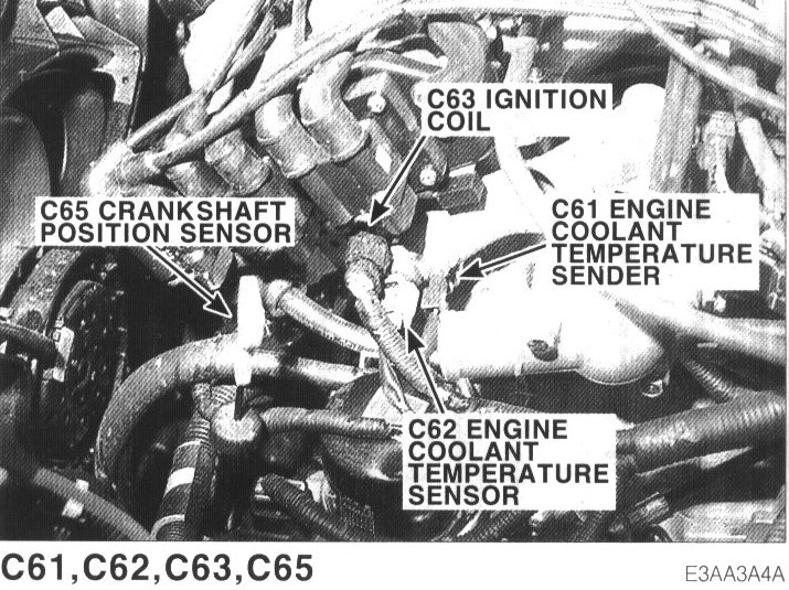 C61, C62, C63, C65 Engine Coolant Temperature Sender, Engine Coolant Temperature Sensor, Ignition Coil, Crankshaft Position Sensor: