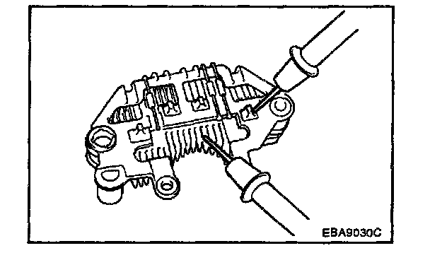 Check for continuity between the positive rectifier and stator coil lead connection terminal with an ohmmeter. The ohmmeter should read continuity in only one direction. If there is continuity in both directions, a diode is shorted.