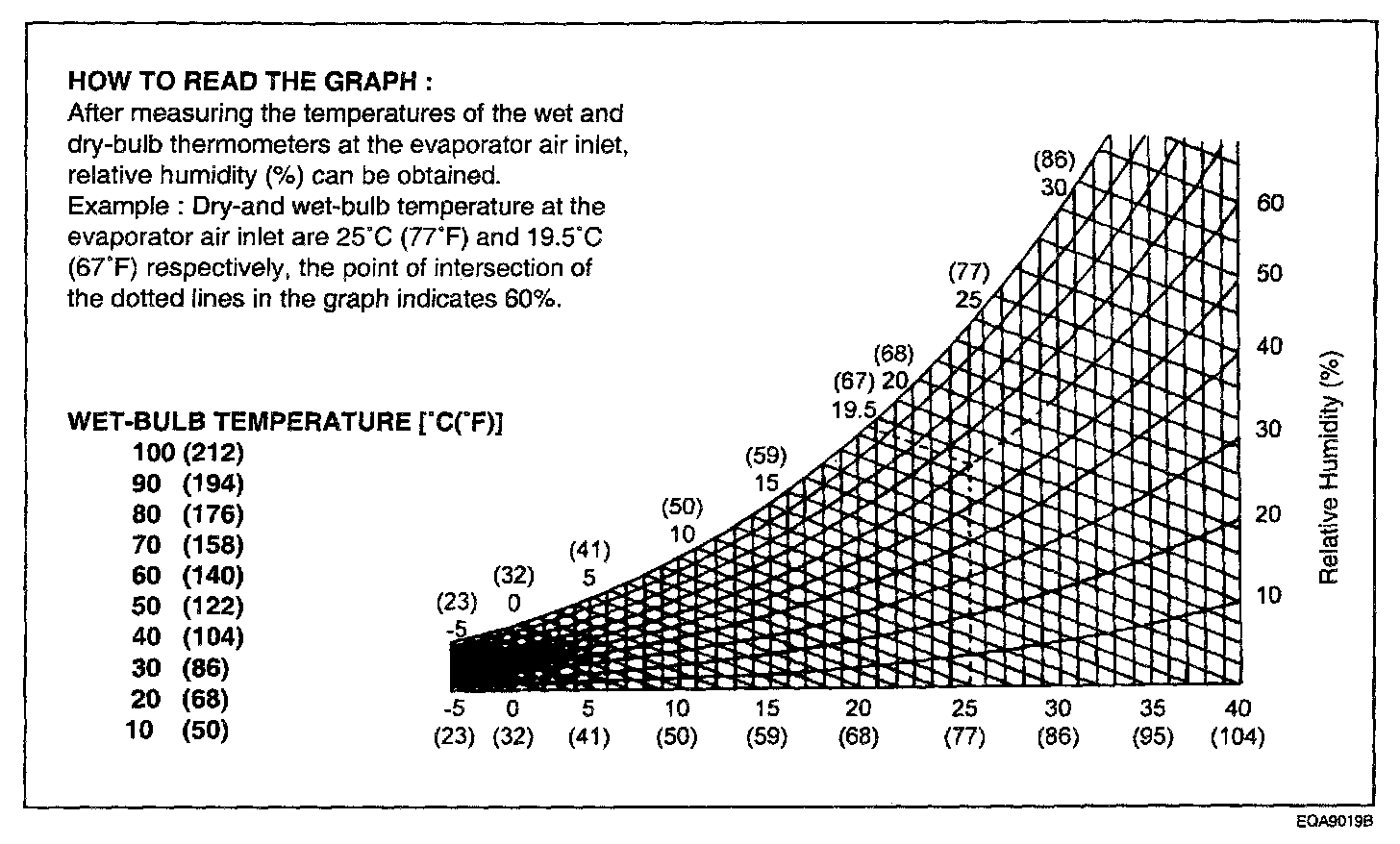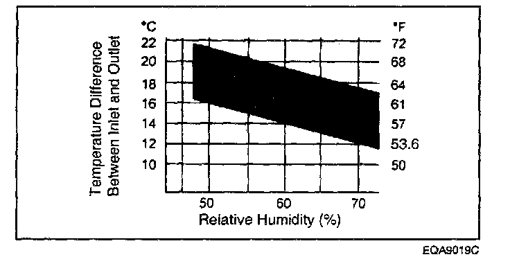 10. Check that the intersection of the relative humidity and temperature difference is within the block hard line. If the intersection is within the block hard line, cooling performance is satisfactory.
