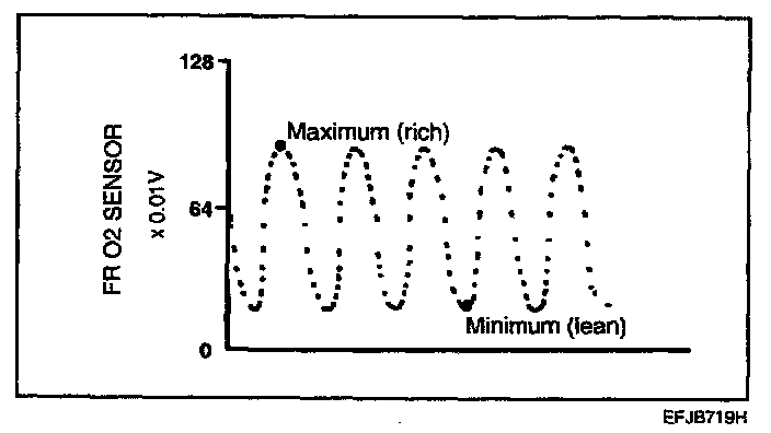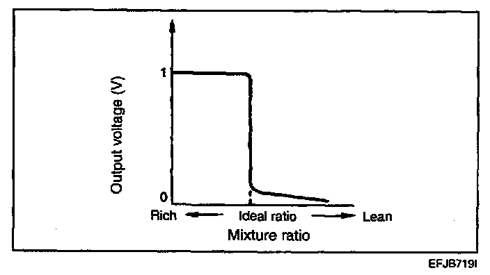 HEATED OXYGEN SENSOR (HO2S)The heated oxygen sensor senses the oxygen concentration in exhaust gas and converts it into a voltage which is sent to the PCM. For Zirconium type sensors, the oxygen sensor outputs about 1 V when the air fuel ratio is richer than the theoretical ratio, and outputs about 0 V when the ratio is leaner (higher oxygen concentration in exhaust gas.). The PCM controls the fuel injection ratio based on this signal so that the air fuel ratio is maintained at the stoichiometric ratio. The oxygen sensor has a heating element which ensures sensor performance during all driving conditions.