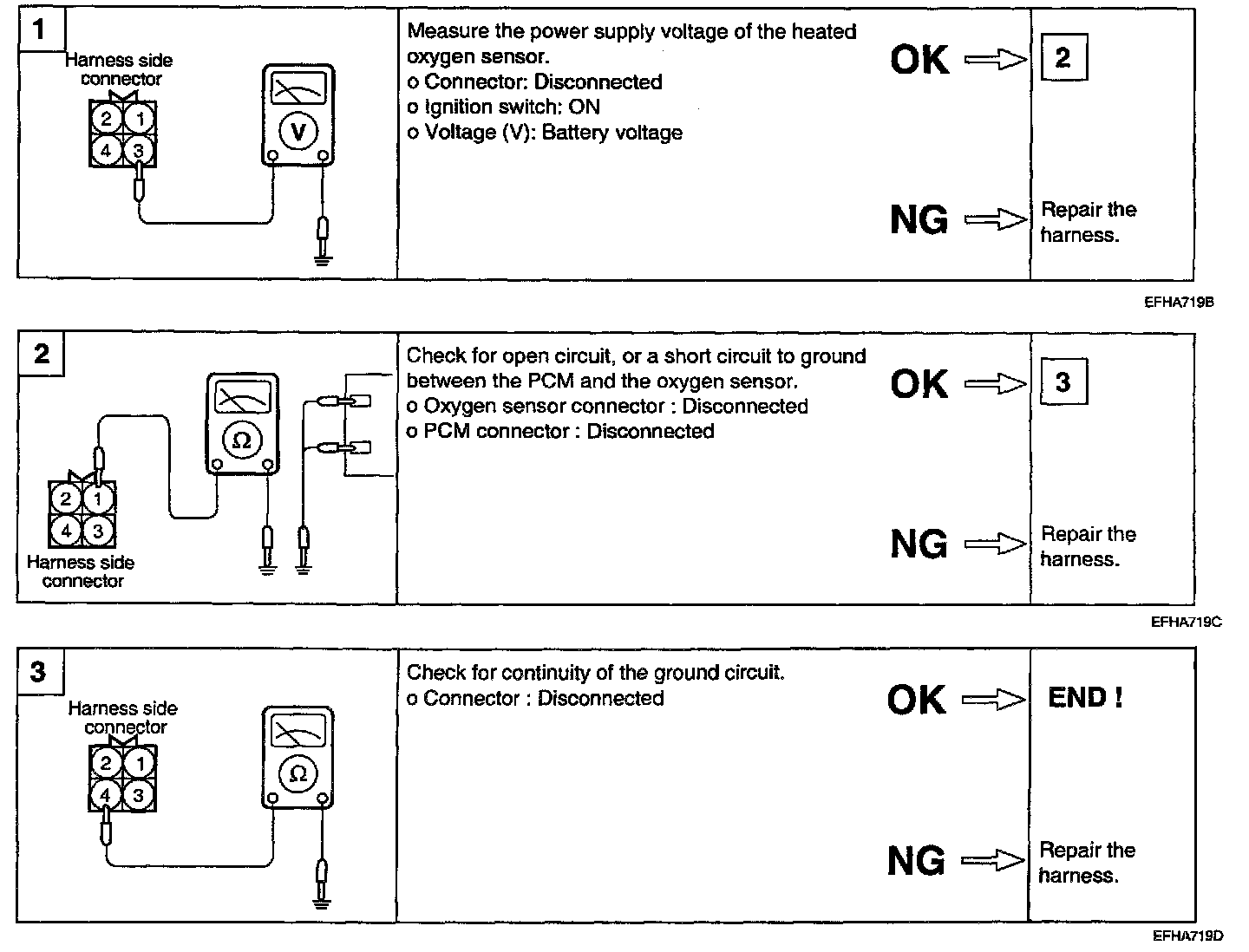 1. Disconnect the oxygen sensor connector, and measure the resistance between terminal 3 and terminal 4.