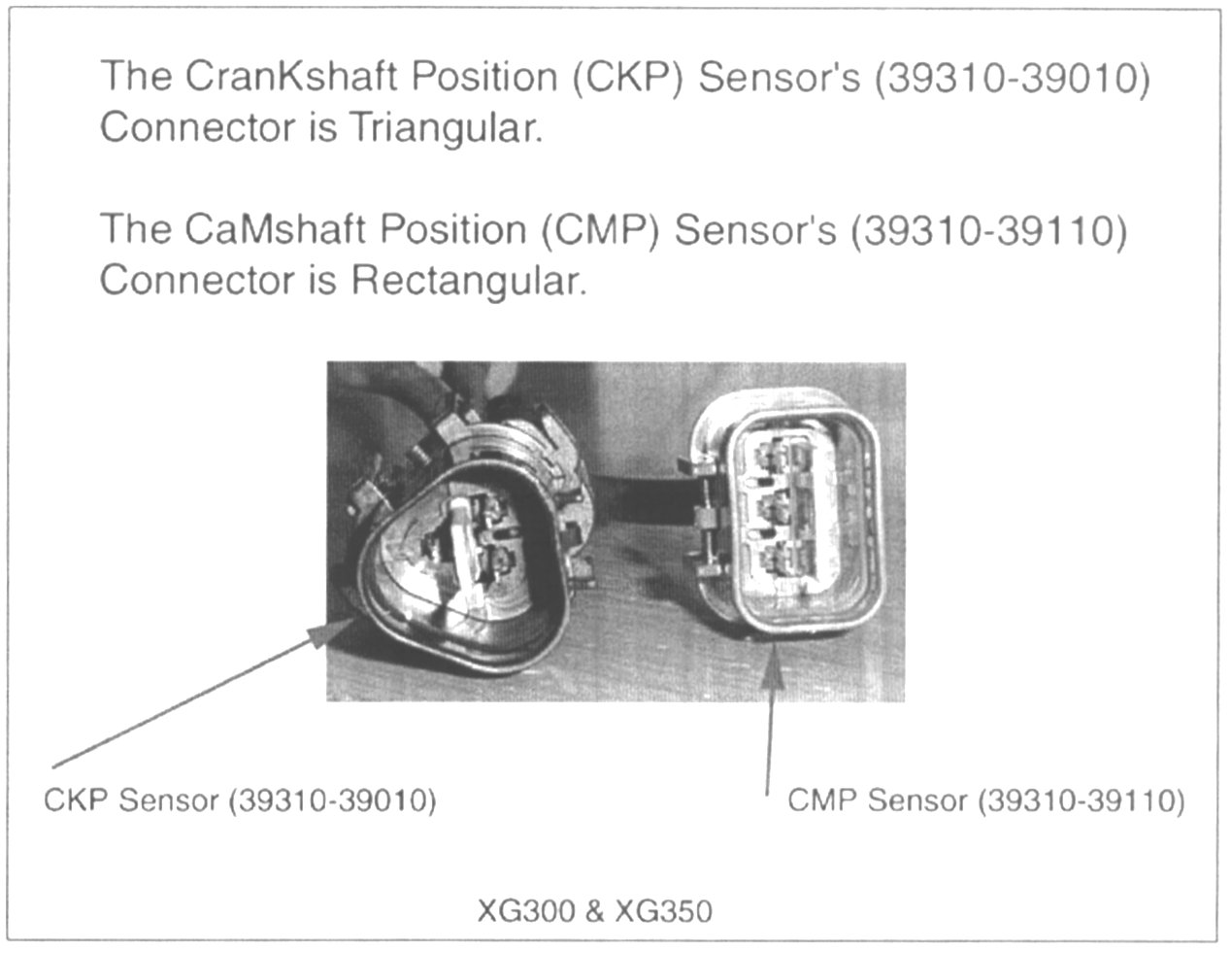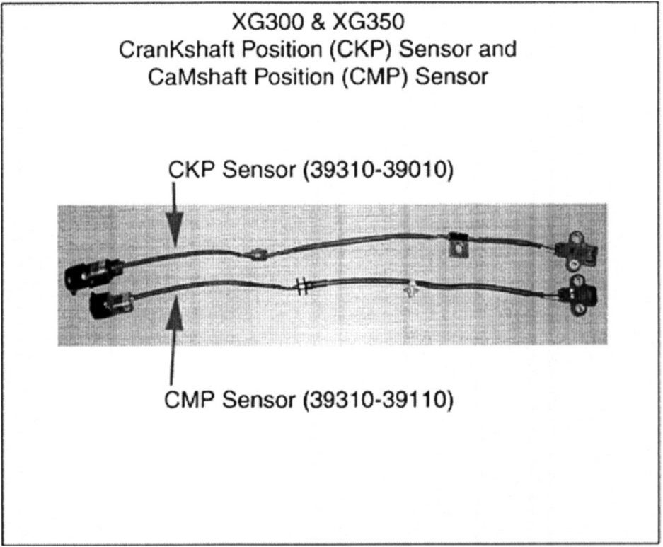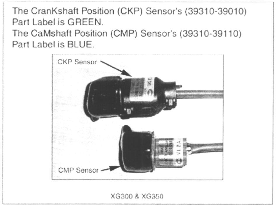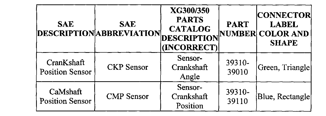The XG300/350 Parts Catalog and the Labels on the Sensors have incorrect descriptions for the Crankshaft and Camshaft Position Sensors.
