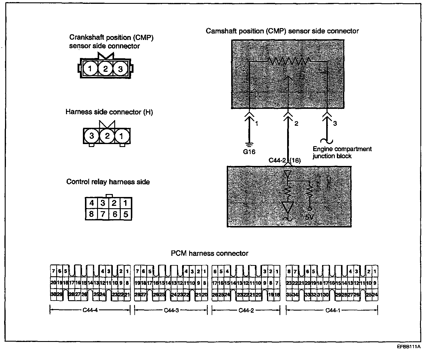 The CMP is a Hall-effect sensor that detects the camshaft position on the compression stroke of the No.1 and No.4 cylinders, converts it into a pulse signal, and inputs it to the PCM. The PCM then computes the fuel injection sequence, etc. based on the input signal.