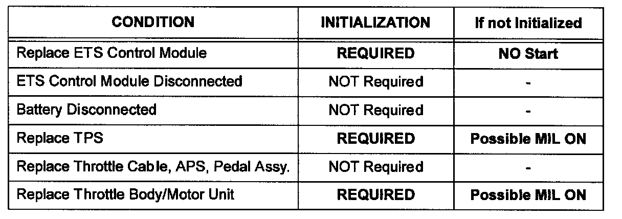 INITIALIZATION is the process by which the ETS Control Module "learns" and memorizes the DC Motor's Rotor position relative to the throttle plate position. It involves taking hundreds of data points of the electric motor's rotor position relative to the throttle plate position from fully closed to fully open and back to fully closed. This learning is critical for the electric motor's quick and precise control of the throttle valve.