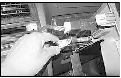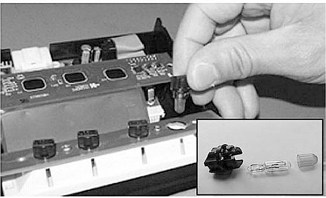 11. Remove and replace all 4 bulbs as a set. Pull the bulb out of the socket, peel the green cover off of the old bulb and place it on the new bulb, then insert the new bulb into the socket.