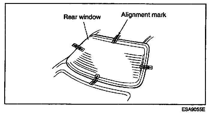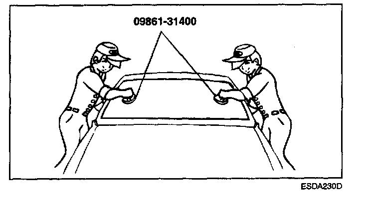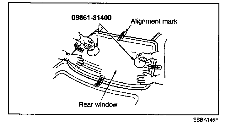 11. Use suction cups or the special tool (09861 - 31400) to hold the rear window over the opening, align it with the alignment marks and set it down on the adhesive. Lightly push on the rear window until its edges are fully seated on the adhesive all the way around.