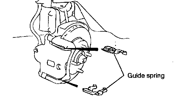 - When replacing the brake pad, check for deformation. When replacing the guide spring, use a new one or the used one after cleaning away foreign material.