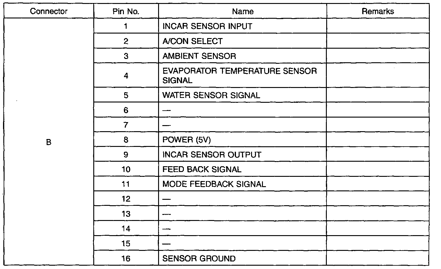 Connector B (Pin Nos: 1 - 16):