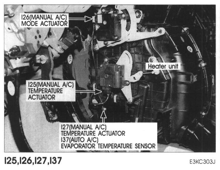 I25 Temperature Actuator, I26 Mode Actuator, I27(Manual A/C) Thermostatic Switch, I37(Auto A/C) Evaporator Temperature Sensor: