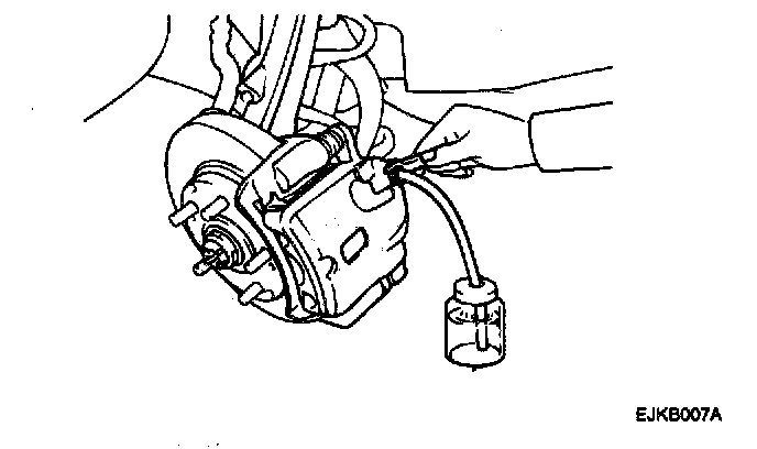 4. While depressing the brake pedal fully, loosen the bleeder plug until the fluid starts to run out. Then close the bleeder plug.