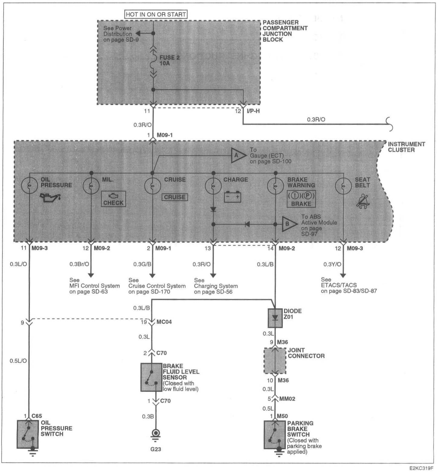 The starting point of each system section is the schematic diagram. These diagrams show how all the components work together, such as electrical current paths from power source to ground (via electrical load), switch connections at each position, and other related circuit functions.
