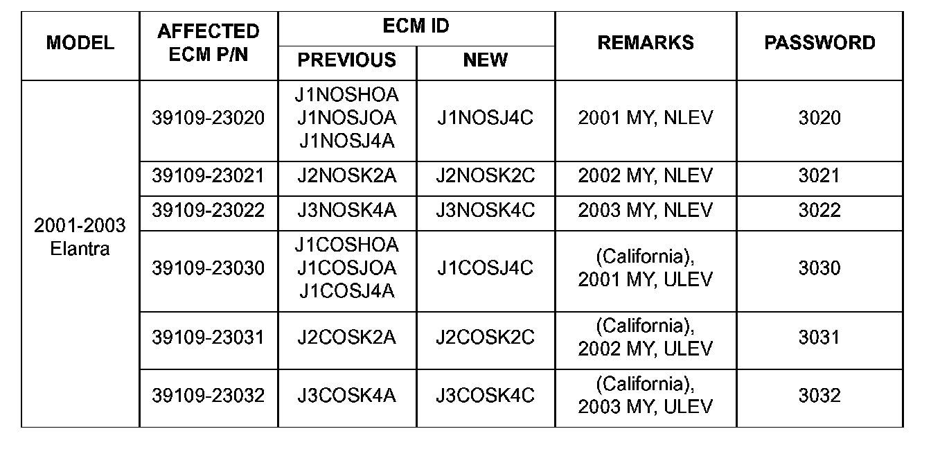 ^ Model: 2001-2003 ELANTRA vehicles