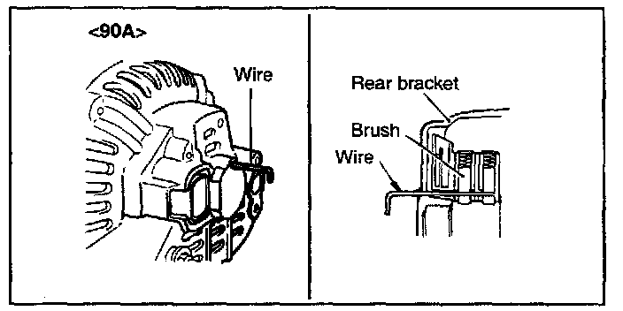 Before the rotor is attached to the rear bracket, insert a wire through the small hole in the rear bracket to lock the brush. After the rotor has been installed, the wire can be removed.
