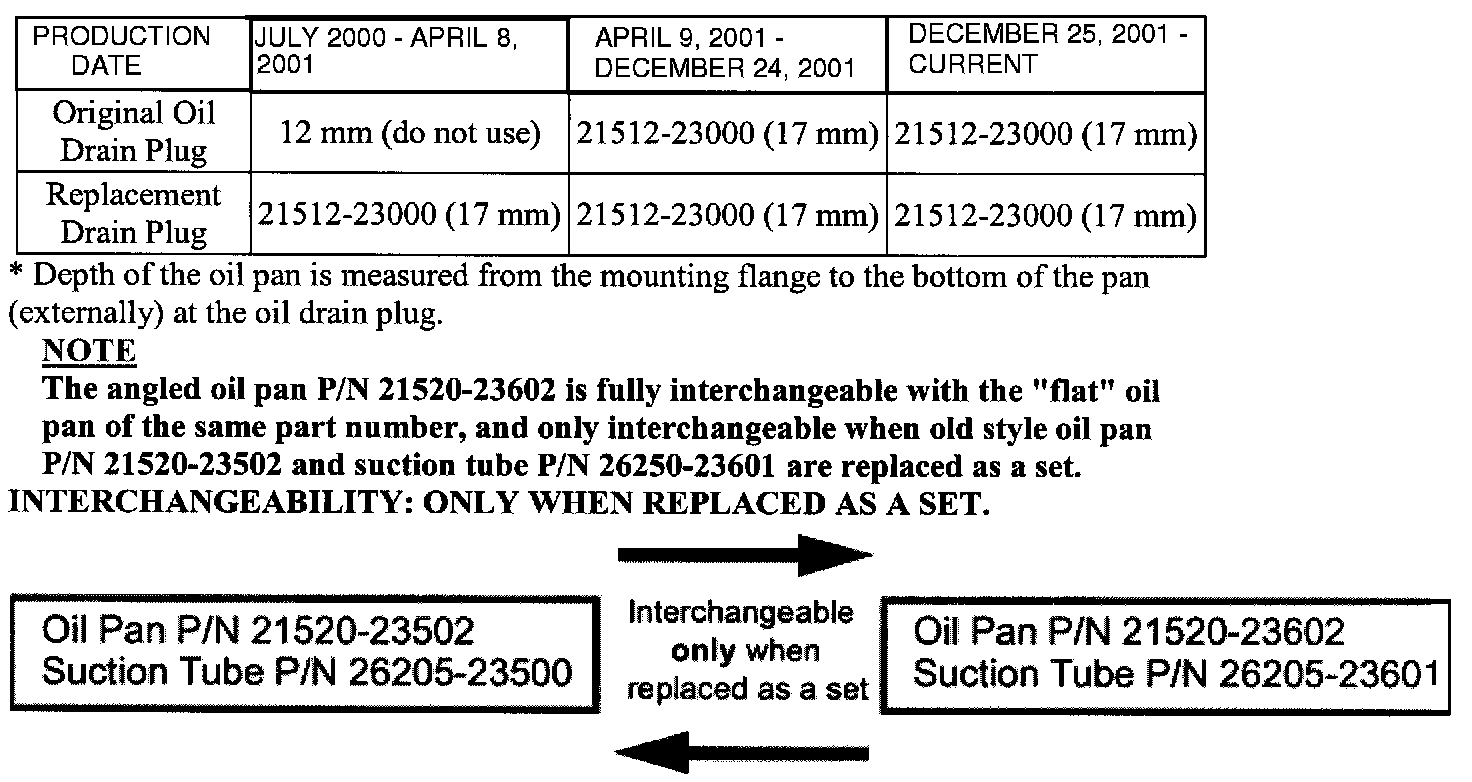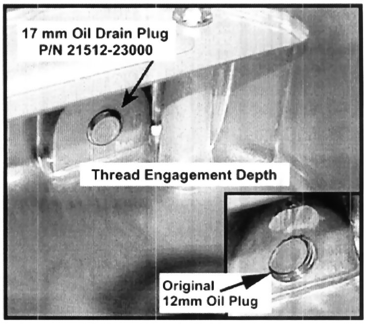 1. The oil drain plug has been changed from 12 mm (thread depth) to 17 mm thread depth. The new oil drain plug part number is 21512-23000.