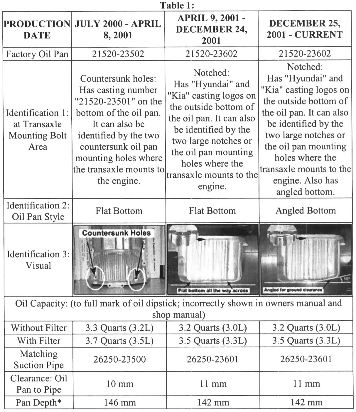 2001-02 ELANTRA OIL PAN, SUCTION TUBE, CAPACITY AND DRAIN PLUG CHANGES