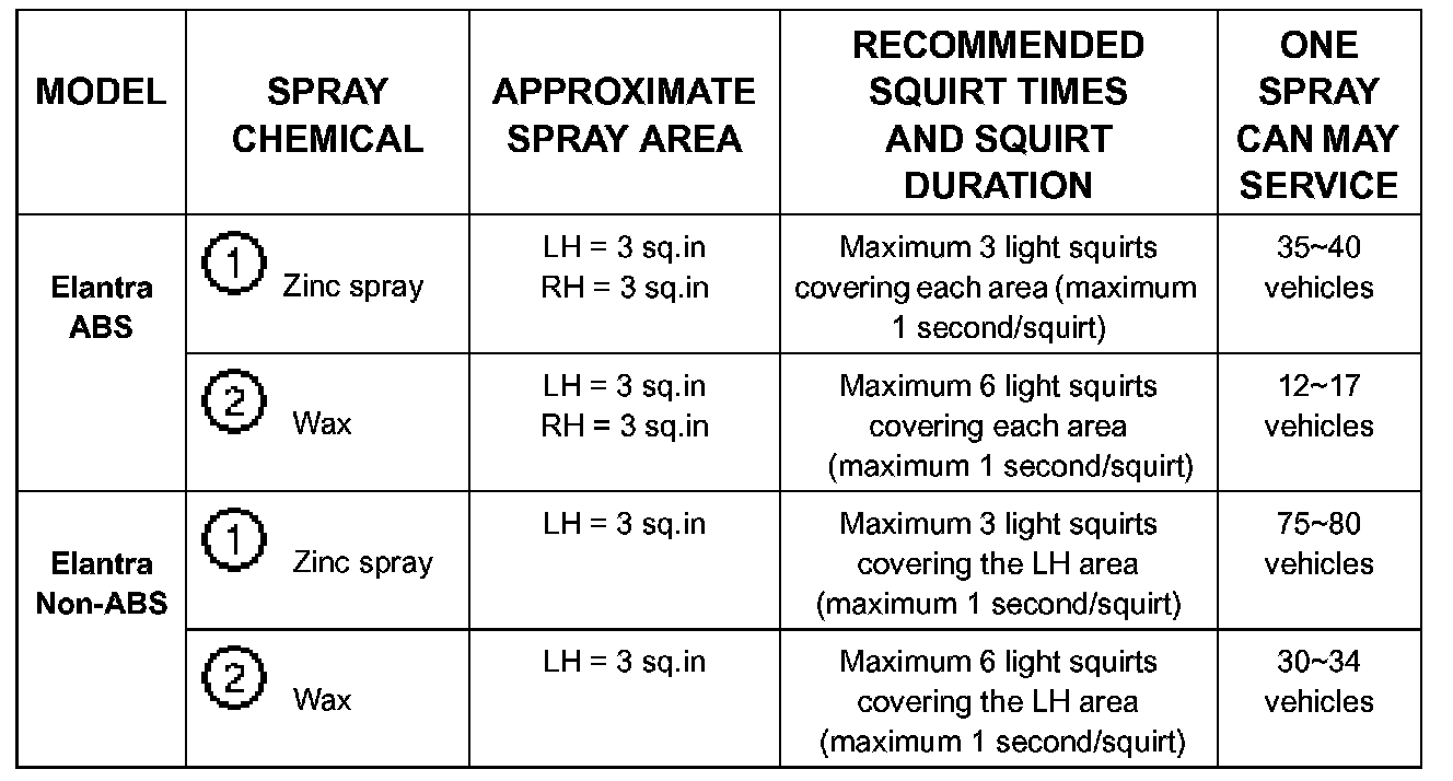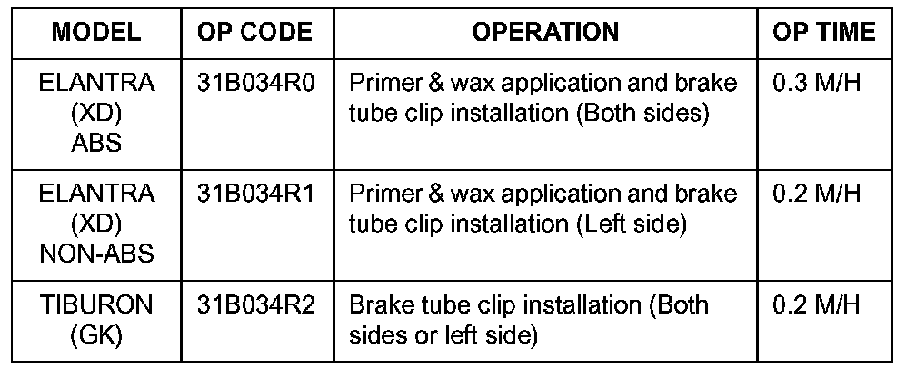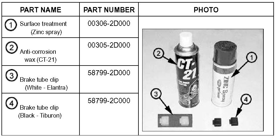1. Elantra vehicles with ABS: Treat the left and right side (two) rear brake tube contact areas with zinc spray and anti-corrosion wax; then install a white color brake tube clip at each contact area (refer to service procedure - A).