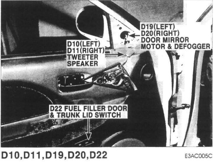 D10 Left Tweeter Speaker, D11 Right Tweeter Speaker, D19 Left Power Door Mirror, D20 Right Power Door Mirror, D22 Fuel Filler Door & Trunk Lid Switch: