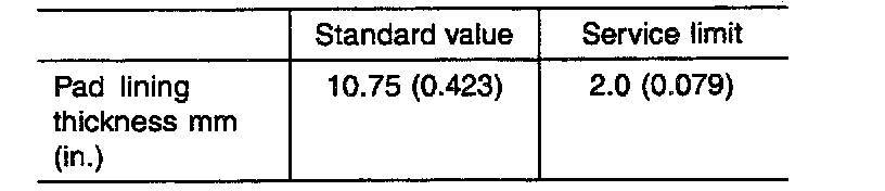 2. Check the pad thickness through the cylinder inspection hole. If the pad lining thickness is out of specification, replace the pads.